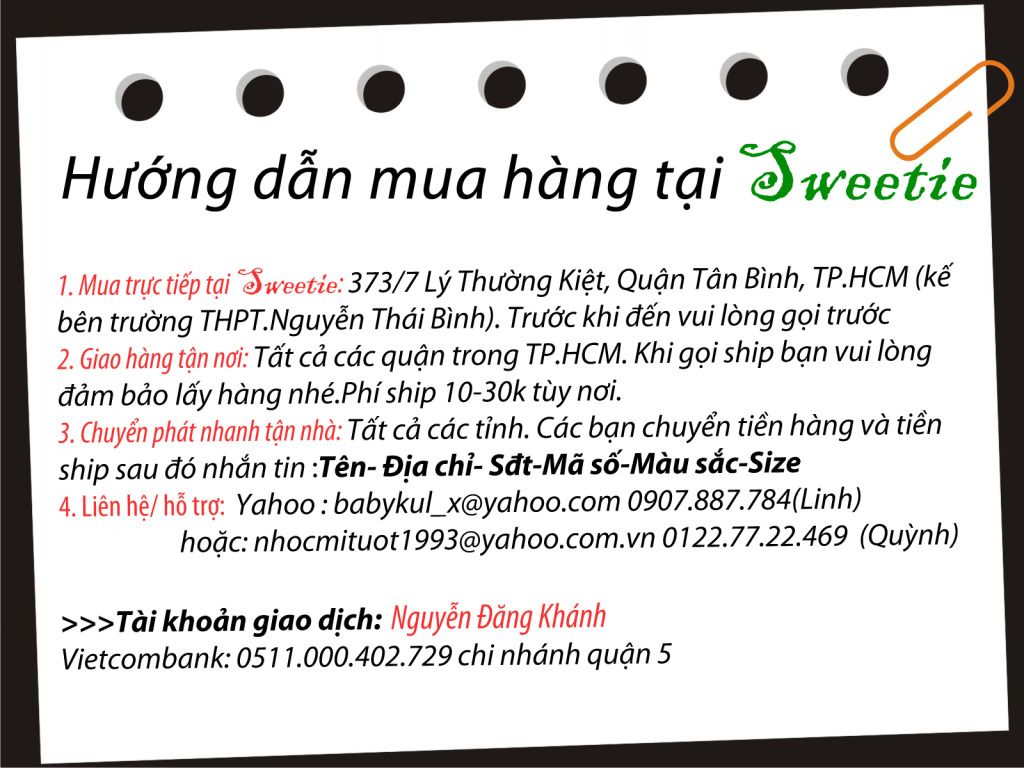 htt://facebook.com/sweetieshop9999 ♥ Nick YAHOO : nhocmituot1993 -- babykul_x ♥ Facebook: Sweetie-Shop ♥ Số điện thoại : 0122.77.22.469 - 0907887784 ♥ Số tk : 0511.000.402.729 - Vietcombank chi nhánh quận 5 - Chủ tk Nguyễn Đăng Khánh ♥ Địa chỉ:373/7 Lý Thường Kiệt,Phường 9,Quận Tân Bình (mình bán ở nhà , khi nào ghé các bạn alo trước là ok) Mình nhận giao hàng tận nơi đối với những bạn ở khu vực TP.HCM với phí ship từ 10-35k.Đối với những bạn ở ngoài khu vực TP.HCM thì các bạn chuyển tiền vào số tk của mình rồi mình sẽ gửi hàng qua bưu điện hoặc gửi bến xe tùy theo yêu cầu ( phí ship từ 20-40k ) Lưu ý : ♥ Các mẫu giày có thể thay đổi giá tùy từng thời điểm và oder,vui lòng cập nhập tại Facebook ^^ !! ♥ Hàng mua rồi miễn đổi hoặc trả lại ( vì vậy xin xem kỹ hàng trước khi mua ) ♥ Không ship để xem hàng . Nếu giao tới các bạn ko lấy vui lòng trả thêm 40k + phí ship thỏa thuận trước đó ![]() UPDATE Hàng Tháng 12 cho các nàng nhé ^^ ![]() MS.18- 180k Dài 70cm ![]() MS.16- 180k Dài 82cm ![]() MS.16- 180k Dài 82cm ![]() MS.16- 180k Dài 82cm ![]() MS.17- 180k Dài 78cm ![]() MS.15- 160k ( 3 màu:đen,hồng phấn,xanh lá mạ ) Dài 65cm ![]() MS.15- 160k ( 3 màu:đen,hồng phấn,xanh lá mạ ) Dài 65cm ![]() MS.15- 160k ( 3 màu:đen,hồng phấn,xanh lá mạ ) Dài 65cm ![]() MS.14 - 150k ( 3 màu:đen,vàng,xanh dương) như hình Chân váy lưng thun ![]() MS.14-150k ( 3 màu:đen,vàn,xanh dương ) ![]() MS.14- 150k ( 3 màu) ![]() MS.13 - 180k ( 2 màu:đen,xám) Dài 88cm ![]() MS.13 - 180k ( 2 màu: đen,xám) Dài 88cm ![]() MS.12- 220k ( 2 màu: xanh đậm,xanh nhạt) như hình Dài 87cm ![]() MS.12- 220k ( 2 màu: xanh đậm,xanh nhạt) như hình Dài 87cm ![]() MS.11- 180k Dài 75-85cm ( dây vai có thể điều chỉnh ![]() MS.10-220k Crop len vạt trước dài 48cm,vạt sau dài 59cm 3 màu: trắng,đen,đỏ ![]() MS.10-220k Crop len vạt trước dài 48cm,vạt sau dài 59cm 3 màu: trắng,đen,đỏ ![]() MS.10-220k Crop len vạt trước dài 48cm,vạt sau dài 59cm 3 màu: trắng,đen,đỏ ![]() MS.09-200k ![]() MS.09-200k ![]() MS.08-170k ( 3 màu:xám đen,trắng,đen) như hình Dài 67cm ![]() ![]() MS.08-170k ( 3 màu:xám đen,trắng,đen) như hình Dài 67cm ![]() ![]() ![]() MS.07-150k ( 3 màu: xanh dương,trắng,đen) Dài 45cm ( crop top) ![]() ![]() MS.06-160k Dài 72cm ![]() MS.05-170k ( 2 màu: cam,đen ) Dài 65cm ![]() MS04-185k Dài 88cm ![]() MS.05-170k ( 2 màu cam,đen) Dài 65cm ![]() MS.03-180k ( 3 màu như hình ) Dài 59cm ![]() ![]() MS02-190k Dài 62cm ![]() MS01-170k Dài 72cm ![]() G.8 - 250k size từ 35-39 ![]() G.9 - 230k size từ 35-39 ![]() G.10 - 230k size từ 35-39 ![]() G.11 - 350k size từ 35-39 ![]() G.12 - 350k size từ 35-39 ![]() G.13 - 350k size từ 35-39 ![]() giầy nhọn retro Anh phong cách Hàn-230k size từ 35-36 ![]() vans đế cao - 220k đế cao 3-5 cm